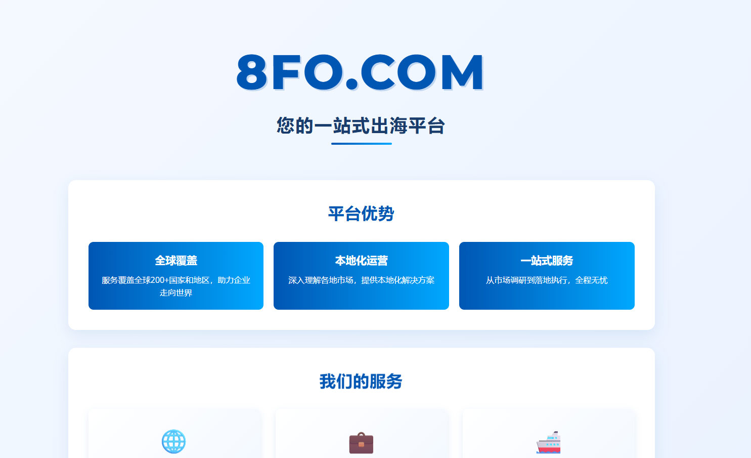 8FO.COM 成立于2003年6月29日,是全球最早的B2B数字贸易平台之一。经过二十年的深厚积淀,我们于2023年开启战略性升级,正式转型为 "AI驱动、跨境赋能、园区深耕" 三位一体的新一代全球资源智能流通生态。 注册成立: 2003年6月29日 战略升级: 2023年启动AI+跨境+园区新战略 核心定位: 二十年产业连接者 · 新一代智能生态构建者